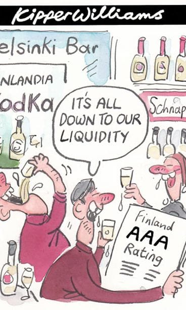 Piirroksesta ilmenee, että Suomella on kolmen A:n luottoluokitus ja samalla piirroksessa viitataan myös suomalaisten maineeseen viinan juojina.
