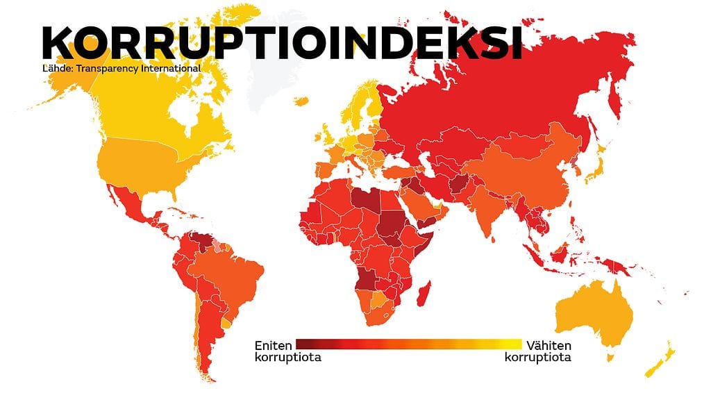 Suomessa on kolmanneksi vähinen korruptiota maailmassa, ilmenee kertoo korruptionvastaisen Transparency Internationalin vuosiraportista. Suomen sijoitus heikentyi edellisvuotisesta yhdellä sijalla.