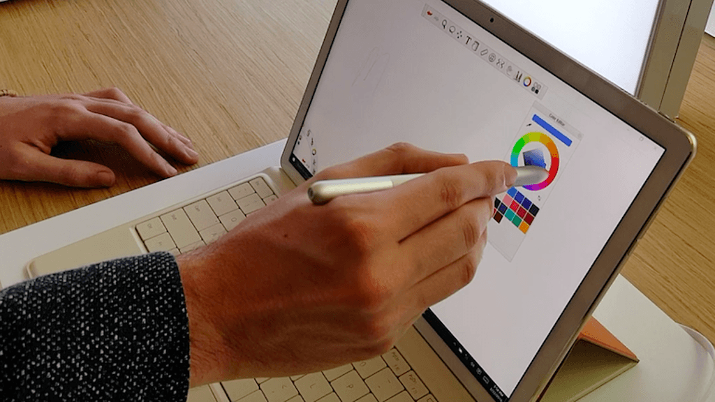 MateBookin kynässä on kilpailijoihin verrattuna mielenkiintoinen ominaisuus. Sitä voi käyttää myös laserosoittimena esimerkiksi Powerpoint-esityksissä. Kynässä olevia nappeja painamalla voi siirtyä kalvoissa eteen- tai taaksepäin.
