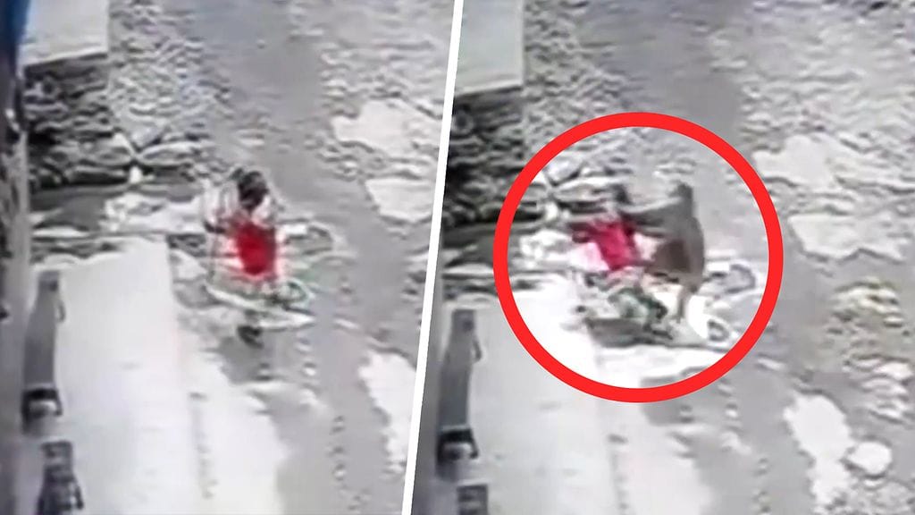 Valvontakameralle tallentui tilanne, kun 3-vuotias tyttö leikki potkulaudalla kotinsa läheisellä kadulla.