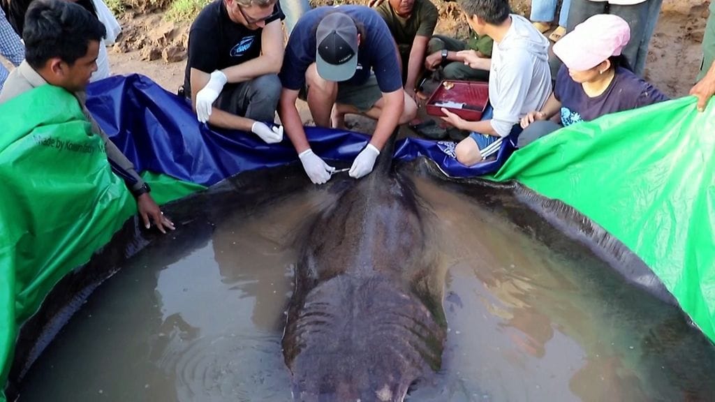 Kansainvälinen tutkijoista ja kalastajista muodostettu ryhmä pyydysti tällä viikolla Kambodžassa virtaavasta Mekong-joesta valtavan keihäsrauskun, kertoo Reuters.
