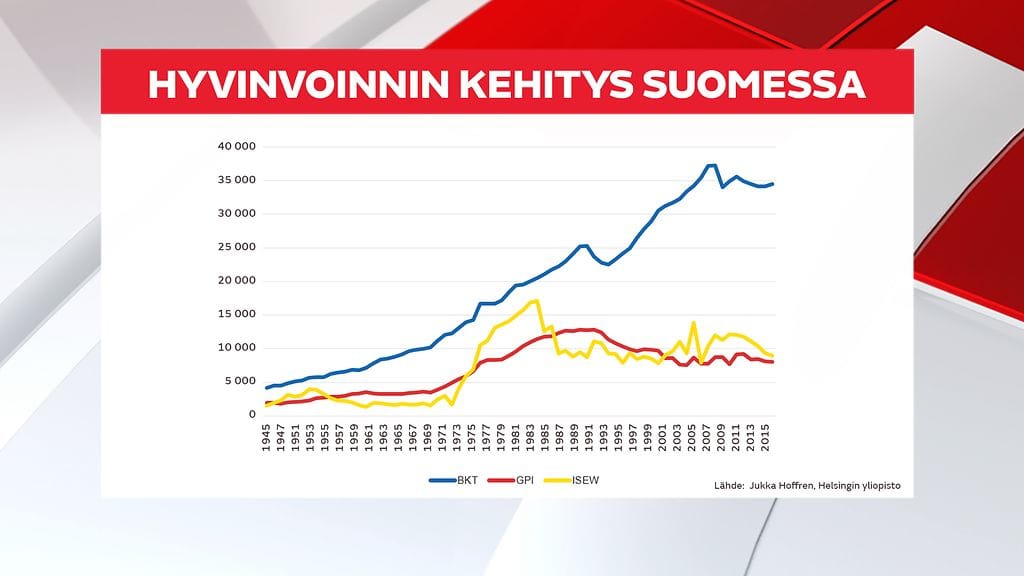 Mittareiden mukaan kansalaisten hyvinvointi ei ole lisääntynyt samassa suhteessa kuin BKT eli bruttokansantuote on noussut. Tavallisen kansan hyvinvoinnin huiput ajoittuvat vuosiin 1983 (ISEW) ja 1991 (GPI).