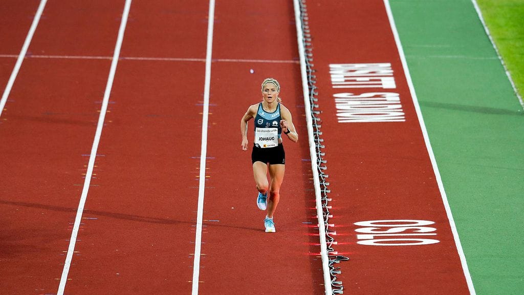 Hiihtotähti Therese Johaug rynni torstai-iltana huiman ajan 10 000 metrin juoksussa Oslossa. Aika 31.40,69 syntyi soolojuoksuna. Tahtia Johaugille antoi kenttää kiertänyt valo.