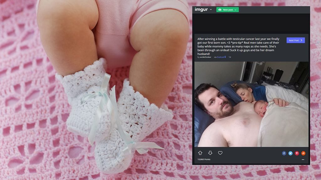 Kuvan oheen hän kirjoitti: "Saimme viimein esikoispoikamme sen jälkeen, kun viime vuonna voitin taistelun kivessyöpää vastaan. Ammattilaisvinkki: oikeat miehet hoitavat vauvaansa sillä aikaa kun äiti ottaa niin monet nokoset kuin tarvitsee. Hän on käynyt läpi koettelemuksen! Kestä se, ja ole hänen unelmamiehensä!"