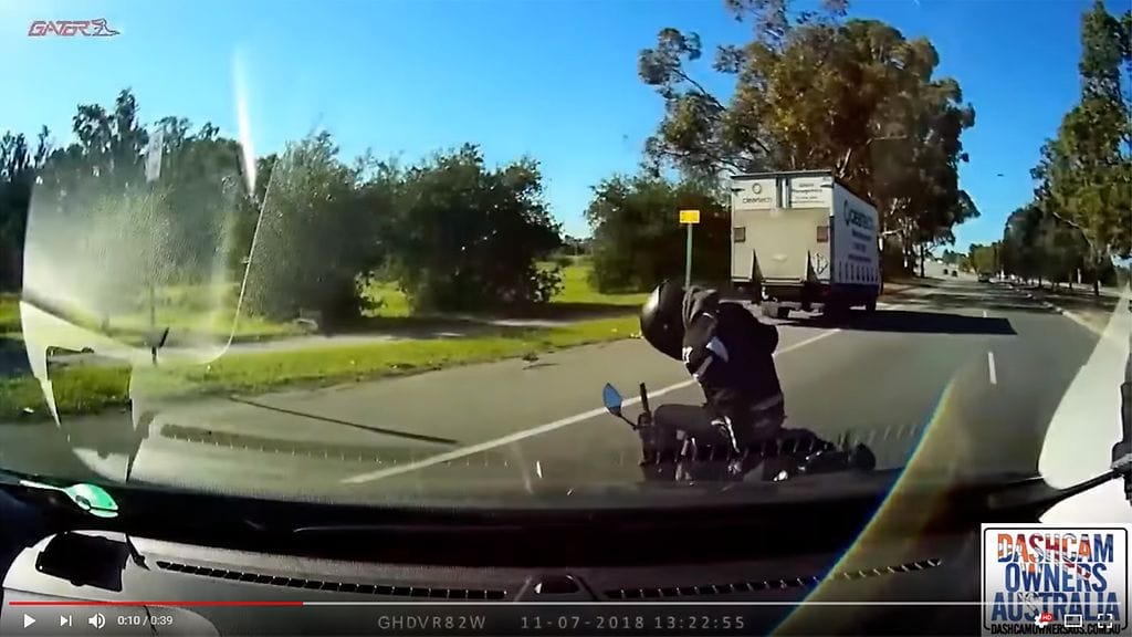 Vaarattomalta vaikuttanut liikennetilanne eskaloitui nopeasti hengenvaaralliseksi. Oheisella videolla nähtävä australialainen moottoripyöräilijä voi pitää itseään äärimmäisen onnekkaana ihan vain siitä syystä, että on edelleen elävien kirjoissa.