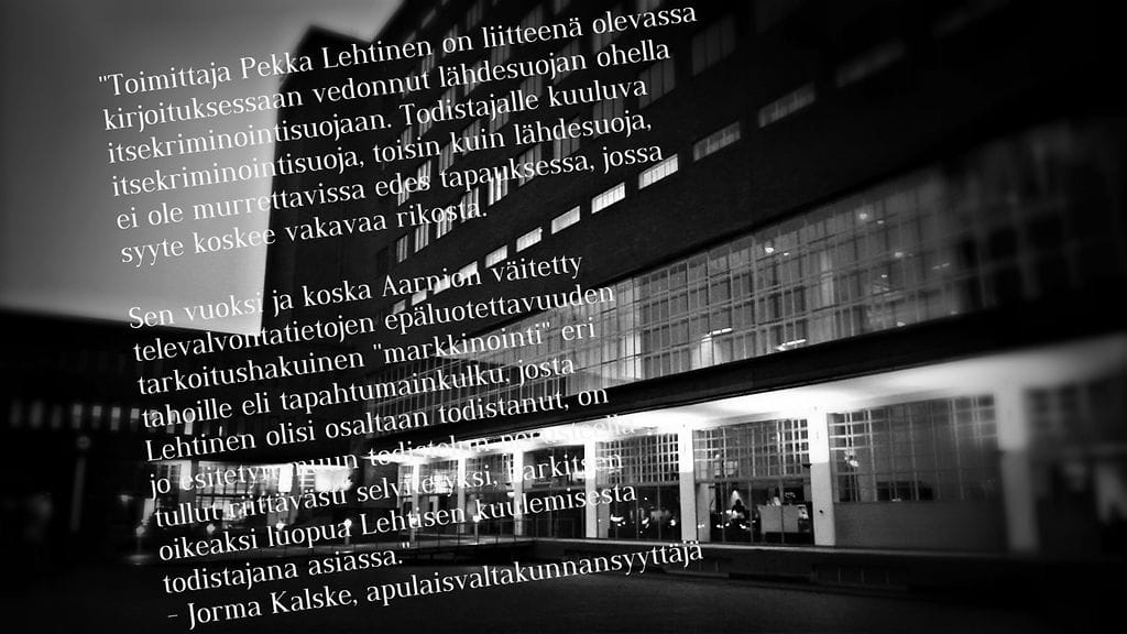 Apulaisvaltakunnansyyttäjä Jorma Kalske luopui MTV Uutisten toimittaja Pekka Lehtisen lähdesuojan murtamisyrityksestä Aarnio-jutussa.