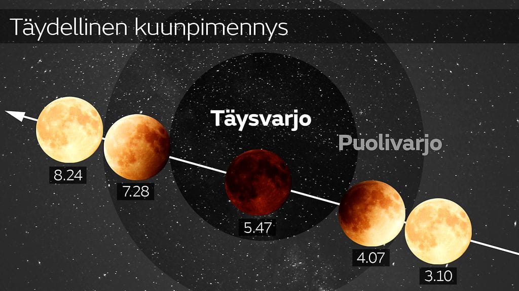 Täydellinen kuunpimennys ajoittuu aamuyölle.