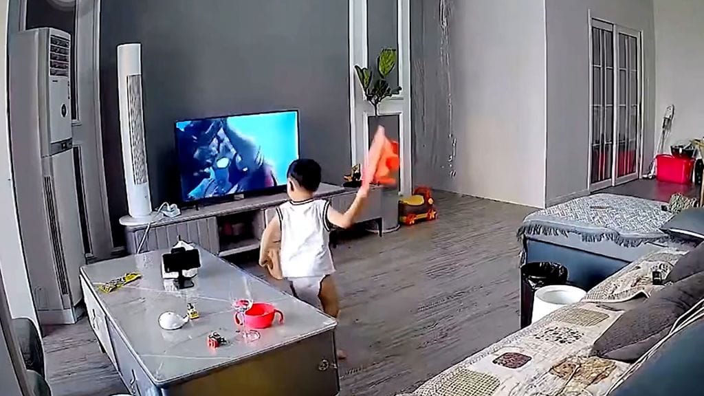 Kodin valvontakamera nappasi kiinalaisperheen olohuoneen tapahtumista raskauttavaa todistusaineistoa, kun perheen pieni poika rikkoi hurmoksessaan perheen taulutelevision.