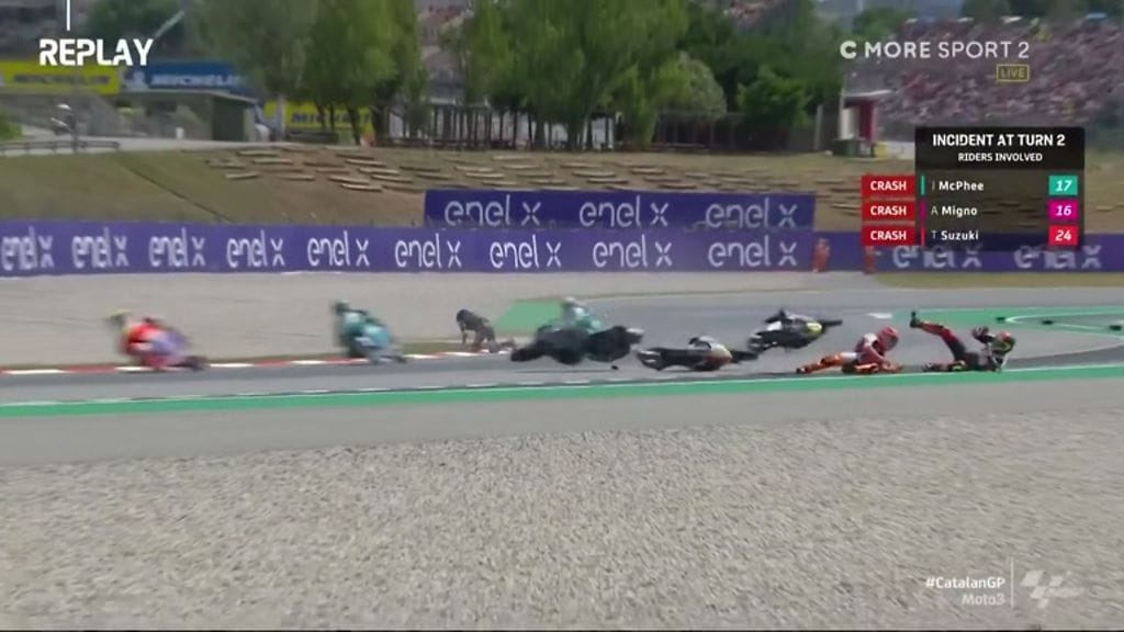 Ratamoottoripyöräilyn MM-sarjan Moto3-luokan sunnuntaisessa Katalonian osakilpailussa nähtiin hurja tilanne, kun kisaa johtaneen brittikuski John McPhee kaatui ja aiheutti radalla vaaratilanteen. McPheen pyörä ajautui kaatumisen jälkeen takaisin ajolinjalle. Useampi kuljettaja onnistui väistämään radalla olleen pyörän, mutta letkan perässä tulleet Japanin Tatsuki Suzuki ja Italian Andrea Migno kaatuivat myös. Kaatuneet pyörät osuivat toisiinsa, mutta suuremmilta henkilövahingoilta onneksi vältyttiin.