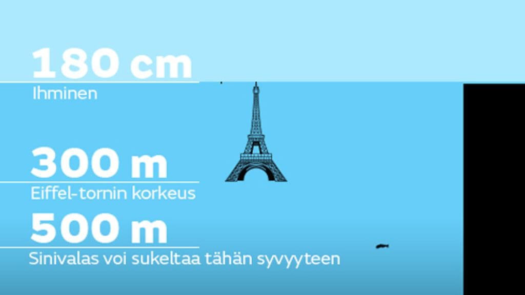- Maailman suurin eläin, sinivalas, voi sukeltaa 500 metrin syvyyteen. Vertailun vuoksi: Eiffel-torni on 300-metrinen, ja korkeimman ihmisten rakentaman rakennuksen, Burj Khalifan, antenni kohoaa 828 metriin.
