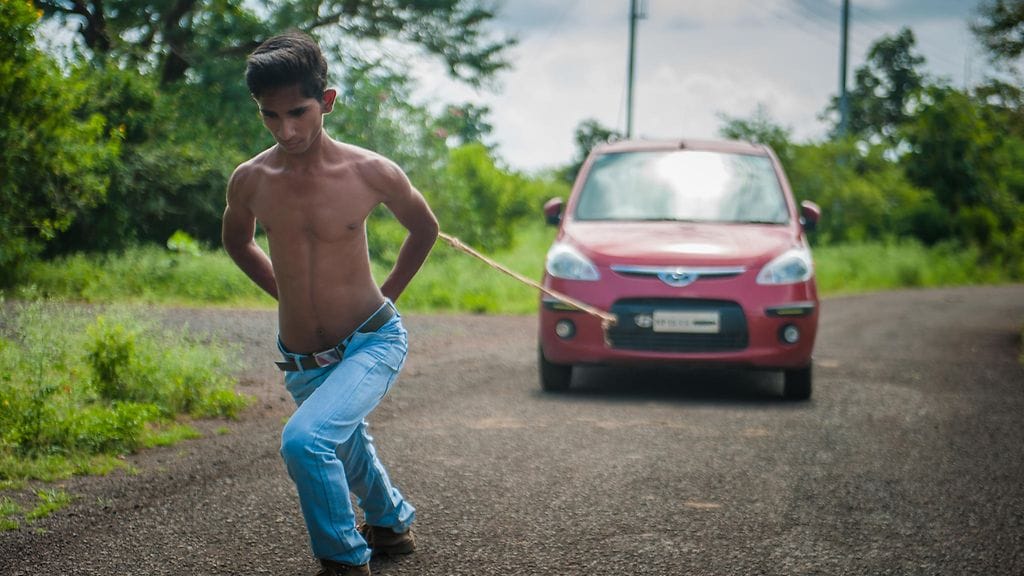 Intialainen teinipoika on keksinyt ainutlaatuisen tavan näyttää voimansa. Hän nimittäin vetää autoja lapaluidensa avulla.