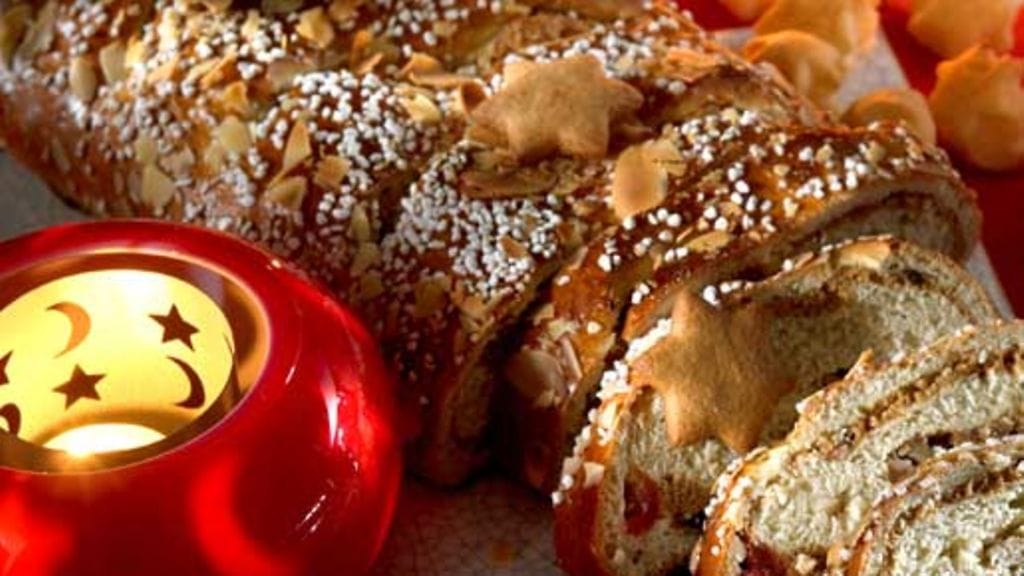 Kohota pitkoa puolisen tuntia lämpimässä paikassa liinan alla. Voitele munalla ja koristele raesokerilla ja mantelilastuilla. Paista 180-asteisen uunin alimmalla tasolla 20–30 min.