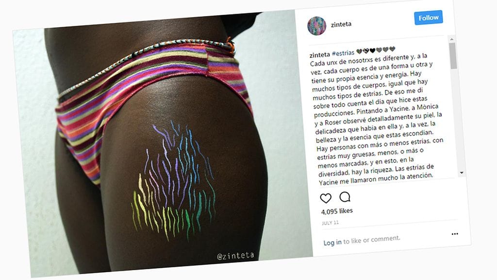 – Siitä asti, kun olemme pieniä, ne panevat meidät vihaamaan kaikkea kehoissamme ja yrittävät jatkuvasti saada meidät eliminoiman kaiken, mikä ei ole "normaalia", kuten ihon läikät, pisamat, ihokarvat ja äärettömän määrän kaikkea muuta, taiteilija kommentoi.