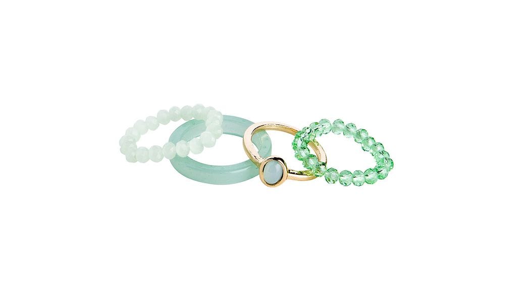 Kyseessä on Cailapin neljän kappaleen vihreä sormussetti, josta kehotetaan olemaan käyttämättä metallista kullanväristä sormusta, jossa on vihreä kivi.