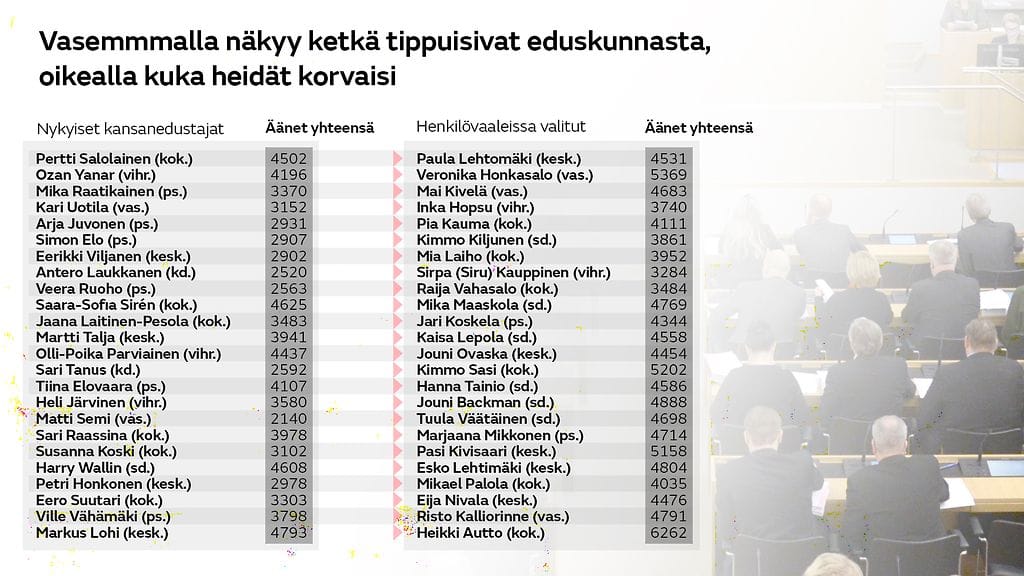 Skenaariossa oletetaan, että suomalaiset olisivat viime vaaleissa äänestäneet samoja henkilöitä kuin nykyisessä vaalitavassa.