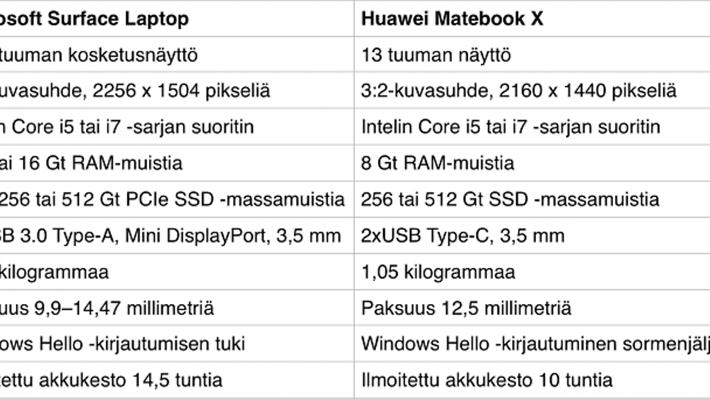 Huawei esitteli tänään kolme uutta Windows-tietokonetta, joista ainakin yksi, MateBook X, on tulossa Suomeenkin myyntiin. Huawei kehui uutuuttaan maailman pienimmäksi 13-tuumaiseksi läppäriksi, ja laitteen ominaisuuksia katsellessa tulee nopeasti mieleen Microsoftin taannoin esittelemä Surface Laptop. Alla tehdään vertailua näiden kahden tuoreen laitteen välillä.