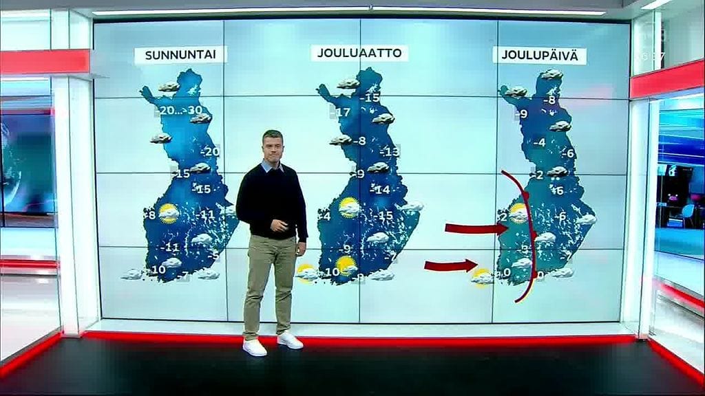 – Siinä on tuollainen liikkuva elementti jouluaaton kohdilla. Se kuinka pitkältä pilvipeite repeää pohjoisesta etelään asti ja mihin kohtaan itä-länsi suunnassa, vaikuttaa hyvin paljon lämpötiloihin, kertoo Forecan meteorologi Jenna Salminen.
