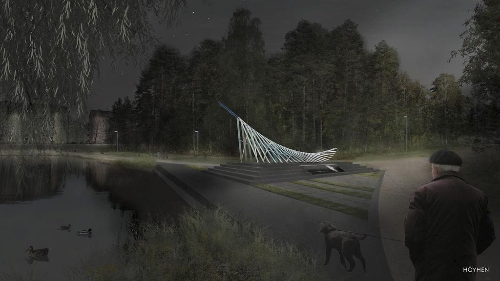 Suunnitteilla olevaan Hippoksen liikuntapuistoon pystytettävän muistomerkin höyhenen muoto tulee rakentumaan useista vierekkäisistä suksenkaltaisista muodoista.