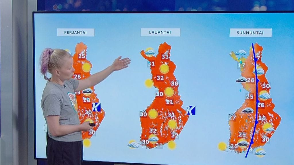 MTV Uutisten meteorologi Miina Manninen ei muista, milloin olisi esitellyt samanlaisia sääkarttoja kuin ensi viikolle on luvassa. Jo alkuviikosta liikutaan 25 ja 30 asteen välillä, mutta loppuviikosta mittari pamahtaa yli kolmenkymmenen koko maassa.
