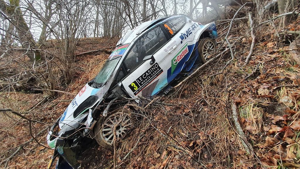 Suninen kaatoi autonsa Monte Carlon MM-rallin ensimmäisen pätkän lopussa. Auto meni niin huonoon kuntoon, ettei sillä voi jatkaa kisaa perjantaina ralli2-säännön turvin.