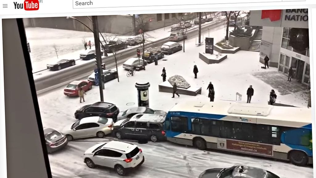 Mäessä sijaitseva tienpätkä Montrealissa, Kanadassa muuttui lumisateen jälkeen järkyttävän liukkaaksi. Samantha Dean jakoi hänen toimistonsa ikkunasta kuvatun videon Youtubessa, josta näkee kuinka liukas keli muutti liikenteen romuralliksi.