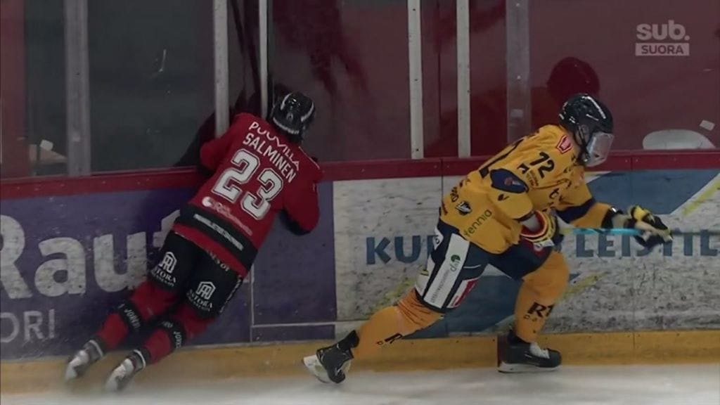 Salminen yritti sytyttää joukkuettaan taistelemaan toisessa erässä jysäyttämällä taklauksen Lukko-puolustaja Samuli Piipposeen.