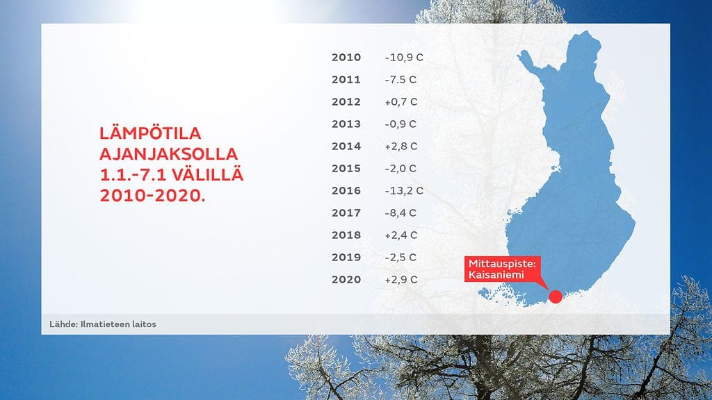 Alkuvuosi on ollut Helsingissä kaikkein lämpimin 11 vuoteen. Tammikuun ensimmäisen viikon keskilämpötila oli tänä vuonna 2,9 astetta. Kaikkein kylmintä tammikuussa oli tuolla ajanjaksolla oli vuonna 2010, jolloin pakkasta mitattiin keskimäärin 10,9 astetta.