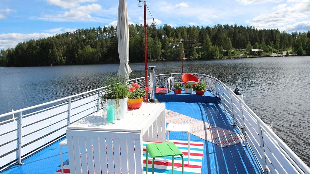 Finaaliin pääsi tämä 130-vuotias teräslaiva, joka on värikäs, huvikumpumainen kokonaisuus. Laivasta löytyy upea aurinkokansi istutuksineen sekä sauna. Omistajat Anniina ja Jarkko Kaurismäki ovat loihtineet vanhasta vesibussista persoonallisen kesäkodin.