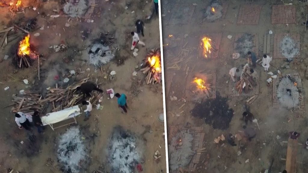 Drone-videolla näkyy, kuinka ruumiita kuljetetaan puulankkujen päällä aukiolle, jossa palaa nuotioita pitkin maata. Pääkaupungissa sijaitsevalla paikalla polttohaudataan koronavirukseen menehtyneitä ihmisiä. Hindulaisuuteen kuuluu, että ruumiit tulee polttaa vuorokauden kuluessa kuolemasta.