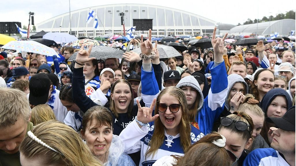 Tampereen Hakametsän hallin parkkipaikalle kerääntynyt yleisö villiintyi, kun maailmanmestaruuden voittaneet Leijonat ilmestyivät juhlalavalle.