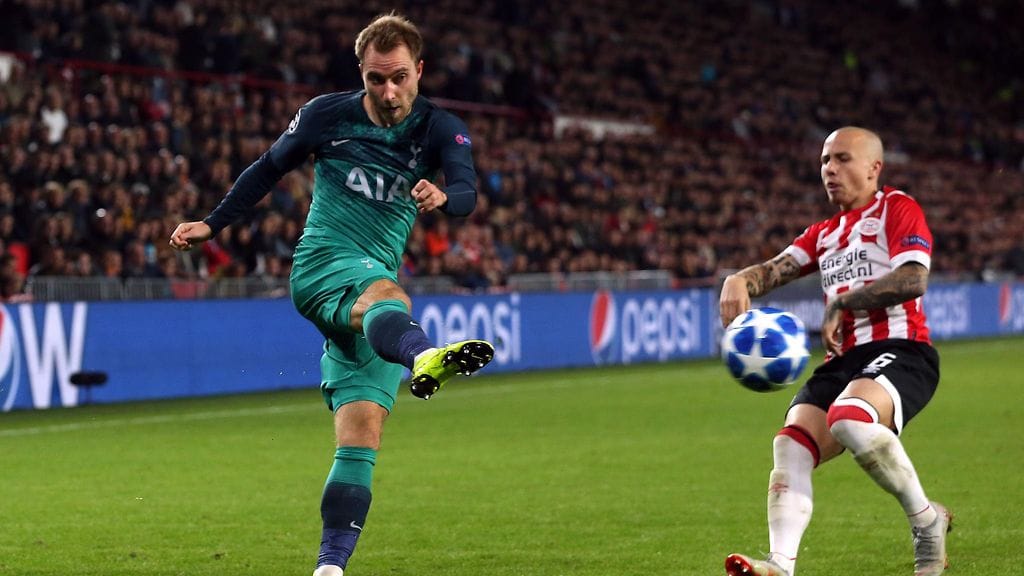 Tanskalaispelintekijä Christian Eriksen näytti parasta osaamistaan Tottenhamin 2-1-johtomaalissa PSV Eindhovenia vastaan.
