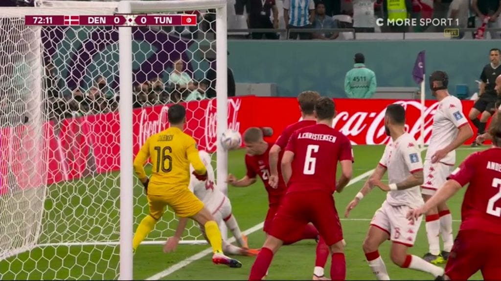 Kentälle vaihdettu Andreas Cornelius pääsi yrittämään maalintekoa lähes Tunisian maaliviivan tuntumasta, mutta pallo ei löytänyt tietään verkkoon.