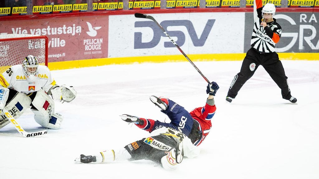 – Jos osutaan ensin kiekkoon ja sen jälkeen jalkoihin, niin on kaksi minuuttia. Mutta jos osutaan yhtä aikaa (jalkoihin), niin se on rangaistuslaukaus, Liigan erotuomarijohtaja Jyri Rönn kertoi ottelun jälkeen.