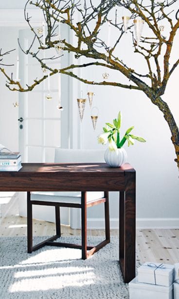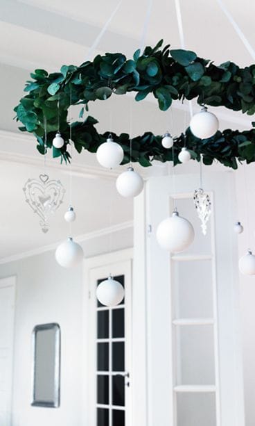 Tee kauneimmista lasipalloistasi ja koristeistasi sommitelma kattokranssiin. Pikkulapsiperheissä tämä on käytännöllinen tapa laittaa arat koristeet esille, kuusessa ne saattaisivat saada kyytiä.