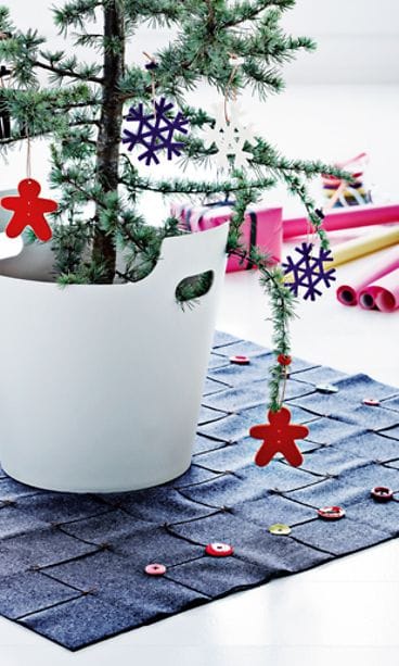 Paperisydämistä tuttua pujottelutekniikkaa voi käyttää myös kankaaseen. Tässä huopasuikaleista on koottu tyylikäs kuusenalusmatto. Napit ilostuttavat reunoja.