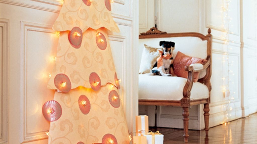 Mieti, kuinka leveän kuusen haluat, ja leikkaa tapetista hiukan tätä pitempi pätkä. Leikkaa vielä kolme palaa. Lado limittäin ja hahmottele kääntöpuolelle kuusi. Kappaleiden alareunat saavat olla vähän leveämpiä kuin alapuolisen osan yläreuna. Leikkaa, kiinnitä toisiinsa. Kuvassa palojen alareunaan on liimattu pala polystyreeniä tuomaan kolmiulotteisuutta. Tee pintaan ristiviillot, joihin pujotat valoköynnöksen. Vahvista tarroilla, kuten kuvassa. Kiinnitä kuusi monesta paikasta seinään esimerkiksi kaksipuoleisella teipillä.