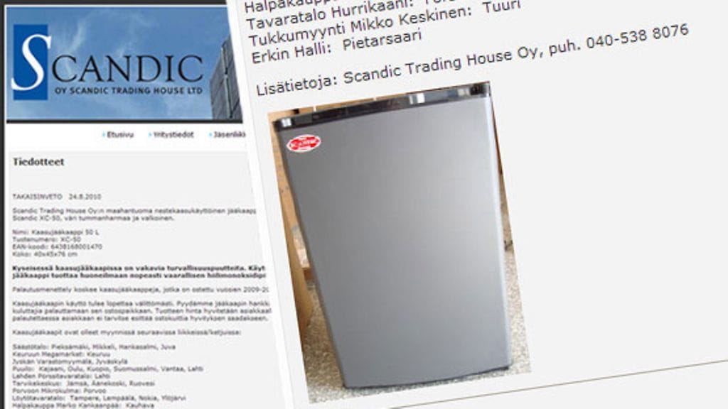Turvatekniikan keskuksen mukaan nestekaasukäyttöisessä Scandic XC-50 -merkkisessä jääkaapissa on todettu vakava turvallisuuspuute. Kaasujääkaappi tuottaa huoneilmaan nopeasti vaarallisen määrän häkää ja aiheuttaa hengenvaaran erityisesti pienissä tiloissa käytettynä.