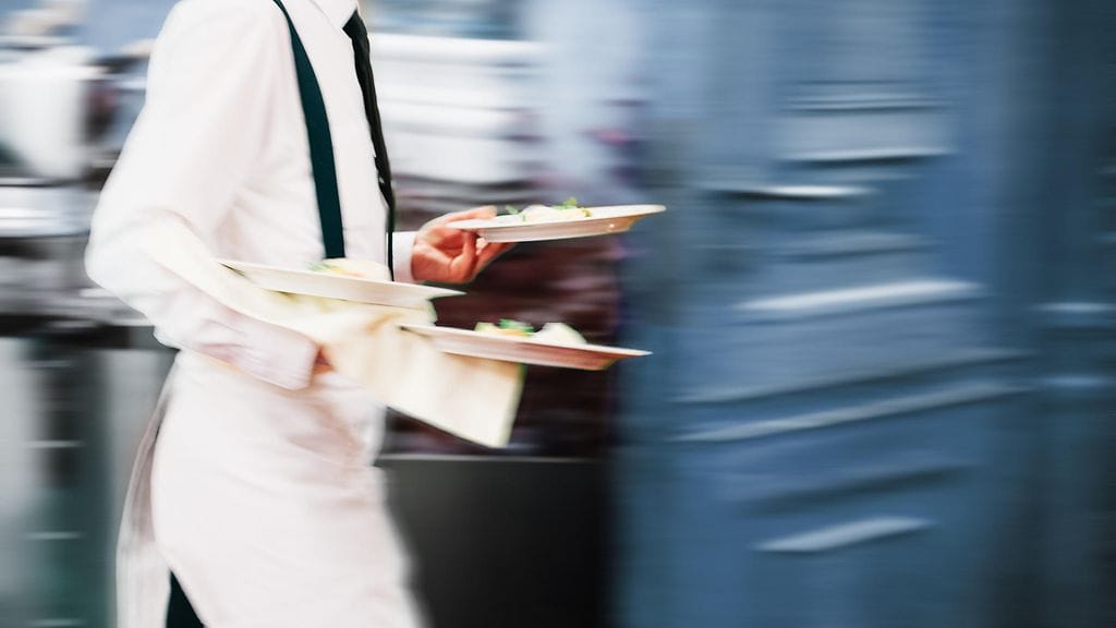 Brittitarjoilija liukastui, mutta onnistui pitämään lautaset käsissään.