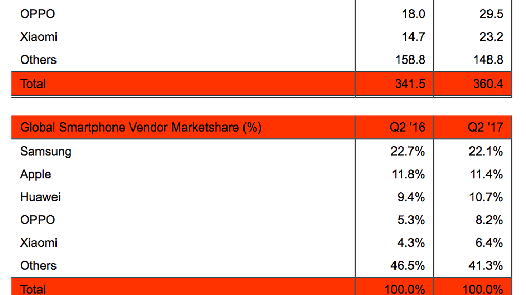 Samsungin markkinaosuus painui 22,7 prosentista 22,1 prosenttiin, mutta sen asema kappalemäärillä mitattuna älypuhelinmyynnin selkeänä ykkösenä säilyi. Applen iPhonen markkinaosuus laski myös 11,8 prosentista 11,4 prosenttiin. Applen markkinaosuus on perinteisesti korkeimillaan loppuvuodesta, kun se tuo myyntiin iPhone-uutuutensa. Applen puhelinmyynti on huomattavasti muita syklisempää sen keskittyneen tuotevalikoiman myötä.