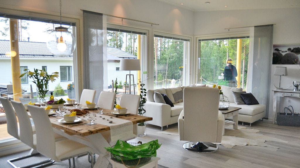 Tästä paras esimerkki on Sievitalon Tunturikoivu, joka on yksi messujen edullisimmista, mutta silti toimiva ja näyttävä koti. Arjen toimivuutta on ajateltu esimerkiksi perheen vaatesäilytyksessä, sillä ulkovaatteet ja kengät saa kätevästi eteisen vieressä sijaitsevaan, ovella suljettavaan huoneeseen, jolloin ne on helppo pitää katseilta piilossa. Luksusta asumiseen tuodaan ylellisillä materiaalivalinnoilla ja suurilla ikkunoilla, jotka päästävät valon sisään.