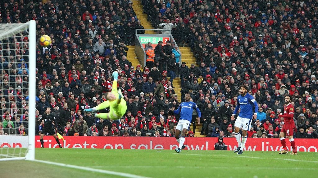 Salah ampui vasemmalla jalallaan pallon yläkulmaan 10.12.2017 Valioliiga-ottelussa Evertonia vastaan. Liverpool siirtyi osumalla 1–0-johtoon, mutta ottelu päättyi 1–1-pistejakoon.
