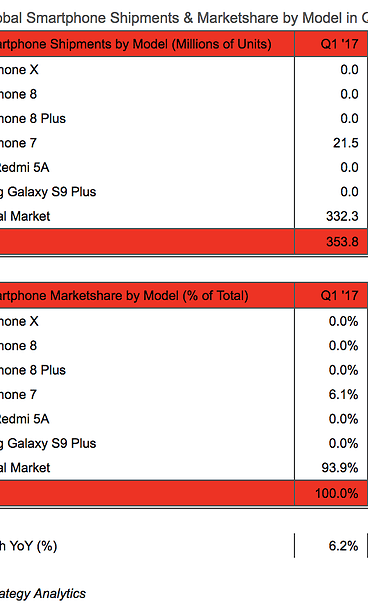 Applen eri iPhone-mallit täyttävät Strategy Analyticsin listauksen eniten toimitetuista älypuhelimista. iPhone 8 ylsi kakkossijalle 12,5 miljoonan toimituksilla ja iPhone 8 Plus kolmanneksi 8,3 miljoonan toimituksilla. Vanhempi iPhone 7 ylsi vielä neljänneksi 5,6 miljoonan puhelimen toimituksilla.