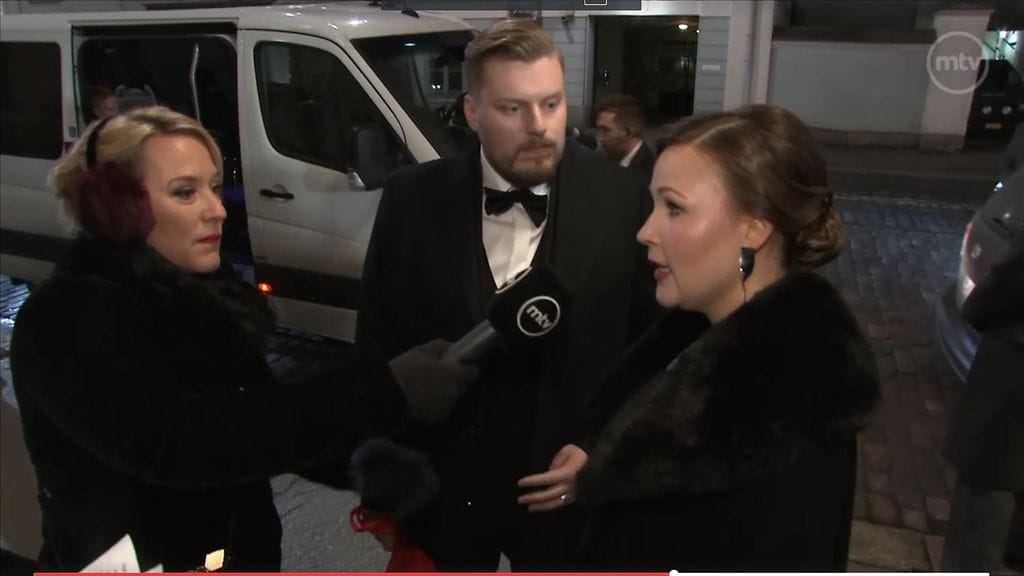 Satokausikalenterin perustaja Samuli Karjula saapui Linnaan Laura-puolisonsa kanssa. Laura Karjulan yllä nähdään kierrätysmateriaalista valmistettu, punakaalilla värjätty puku. Puku on herättänyt runsaasti keskustelua jo ennakkoon.