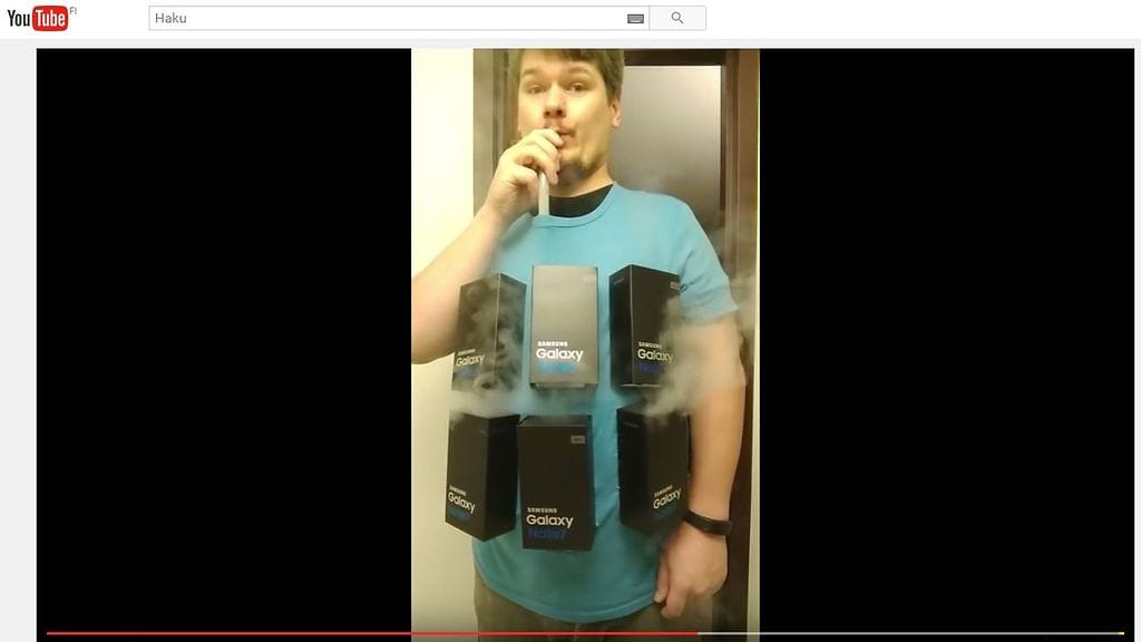 Imgur-käyttäjä excit3d on nimittäin kiinnittänyt t-paitaansa useita Samsung Galaxy Note7 -puhelimen myyntipakkauksia. Lisäksi paidan kaula-aukosta pilkottavan letkun avulla myyntipakkauksiin saa lisättyä oikean savuefektin.