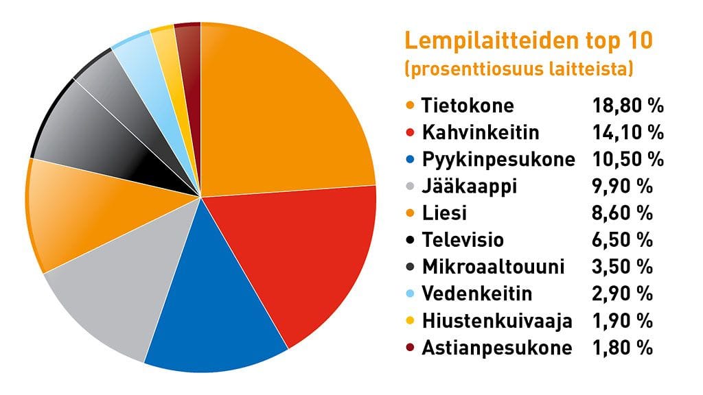 – Oli aika yllättävää, että tietokone on noin selkeä ykkönen. Mutta toisaalta se auttaa arjessa monessa asiassa. Kahvinkeitin puolestaan pelastaa monen aamut. Myös pyykinpesukone on selvä valinta, sillä menee aika hankalaksi, jos pyykit pitää pestä käsin tai käydä pesemässä kodin ulkopuolella, tuumii energia-asiantuntija Airi Laakkonen Vattenfallilta.