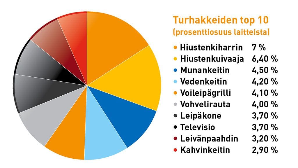 Turhimmiksi nimettyjen laitteiden kolmen kärjessä olivat hiustenkiharrin, hiustenkuivaaja ja munankeitin. Ovatko vastaajina olleet vaimojaan odottamaan kyllästyneet miehet?