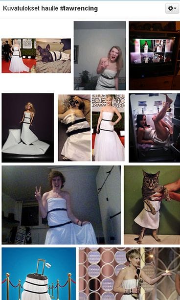 Twitter-hitti puvusta tuli viimeistään siinä vaiheessa, kun muun muassa Arrow-sarjasta tuttu Colton Haynes teippasi itselleen Lawrencen asua muistuttavan virityksen ylleen ja levitti kuvaa netissä. Muut seurasivat perässä. "Lawrencing"-hashtagilla varustetuissa kuvissa pukua matkittiin muun muassa pukemalla koiria ja kissoja tyynyliinoihin ja pyyhkeisiin.