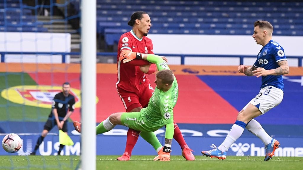 Puhuttavin tilanne nähtiin kuitenkin Evertonin päädyssä kymmenen minuutin kohdalla, kun ylös noussut Liverpool-toppari Virgil van Dijk yritti maalintekoa pienestä kulmasta. Tilanteeseen myöhässä ryntäsi Evertonin maalivahti Jordan Pickford, joka syöksyi hollantilaisen jalkoihin vaarallisesti.