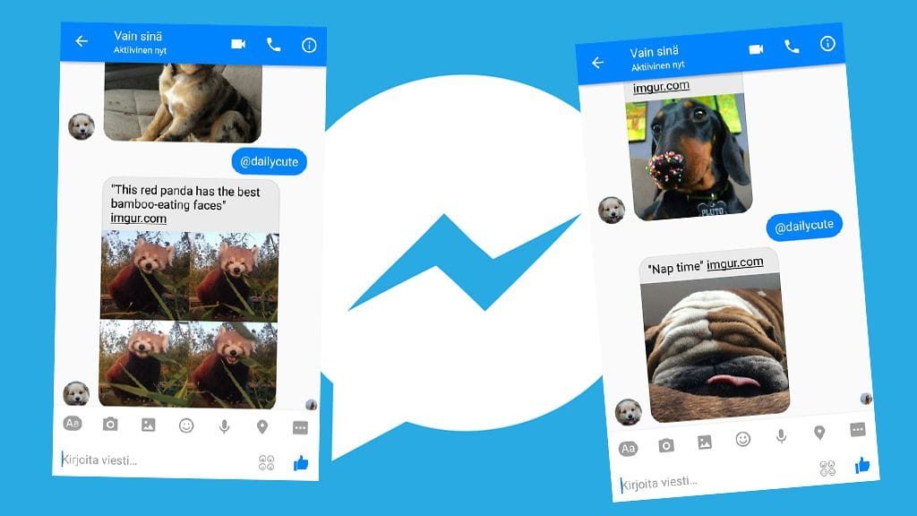 Jos eläinkuva ei ilmesty Messengeriin, päivitä sovellus uusimpaan versioon. Alla esimerkkejä sovelluksen tarjoamista päivän piristyksistä eli söpöistä eläinkuvista.
