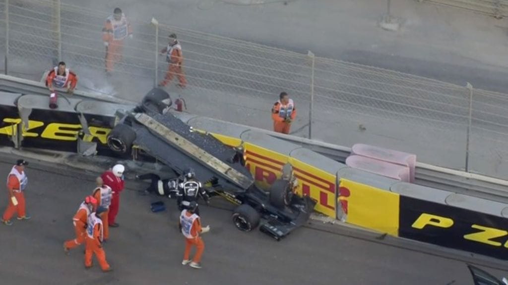 Auto pysähtyi pehmusteisiin, mutta Hülkenberg jäi roikkumaan autoon pää alaspäin. Samaan aikaan auton perästä alkoi näkyä liekkejä. Halo-nimellä tunnettu turvakaari esti pelastautumisen.